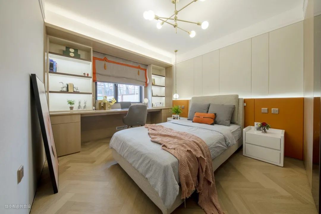 橙色系搭配淡淡的灰色调,配合简约内敛的木质肌理,取得适宜生活的温度平衡。考虑到妹妹还在上学,对书本、杂物的收纳需求较大,设计师特意设计了多储物的书柜,加长的书桌。