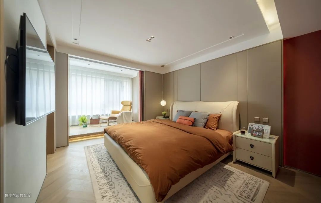 卧室空间以咖色为主调,在床头墙板和衣柜的连接处选用红色的壁布来提升空间的喜庆氛围。