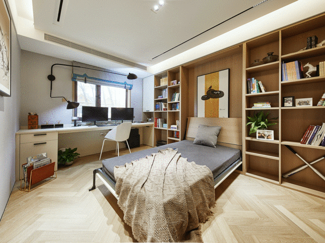 书房的设置采用了空间叠加术,既可以作为书房、客房或将来用于儿童娱乐空间使用,墙面上隐形收纳的折叠床也满足了客房的使用功能。
