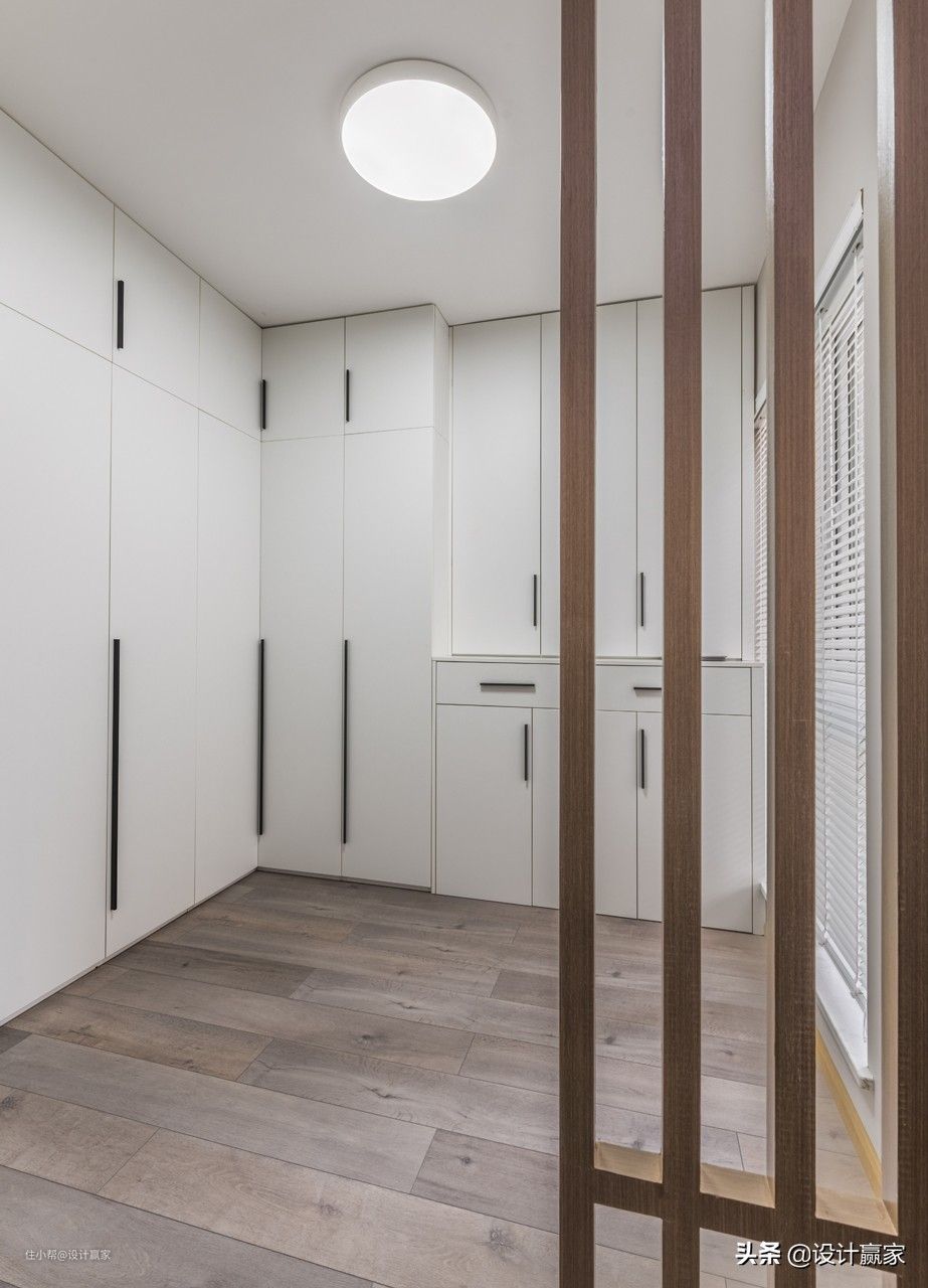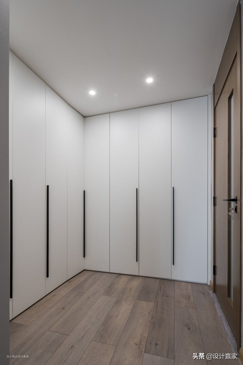 功能实用的衣柜设计,可以轻易收纳长短衣物,大小包包,白色搭配木纹地板,柔和温润。