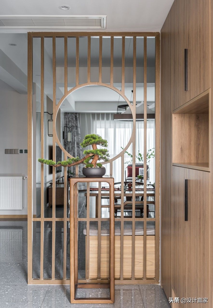 一进门,迎客盆景映入眼帘,高高的底座将其衬托的悠然挺拔,与中间圆形的镂空屏风组合成最自然的装饰画,再搭配以温润的木质,显得精致和谐。