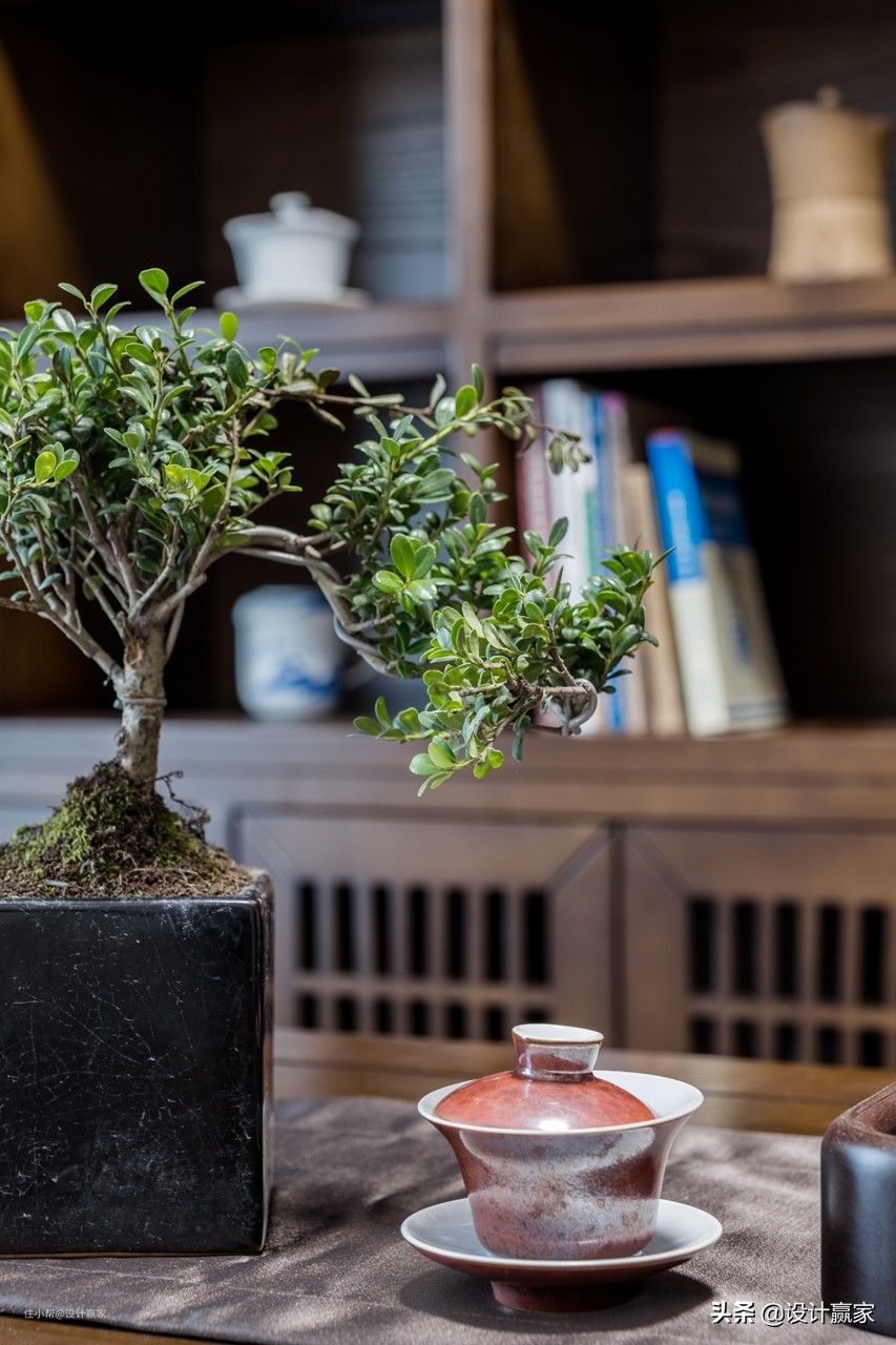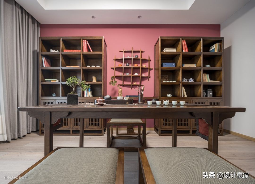 两个并排的展示柜摆放着有关茶文件的书籍和器件,中间凸出墙面渐隐的展示架陈设的是各种喝茶的器皿,空间中不时还飘来阵阵的茶香,像是业主早早泡好的茶一般。