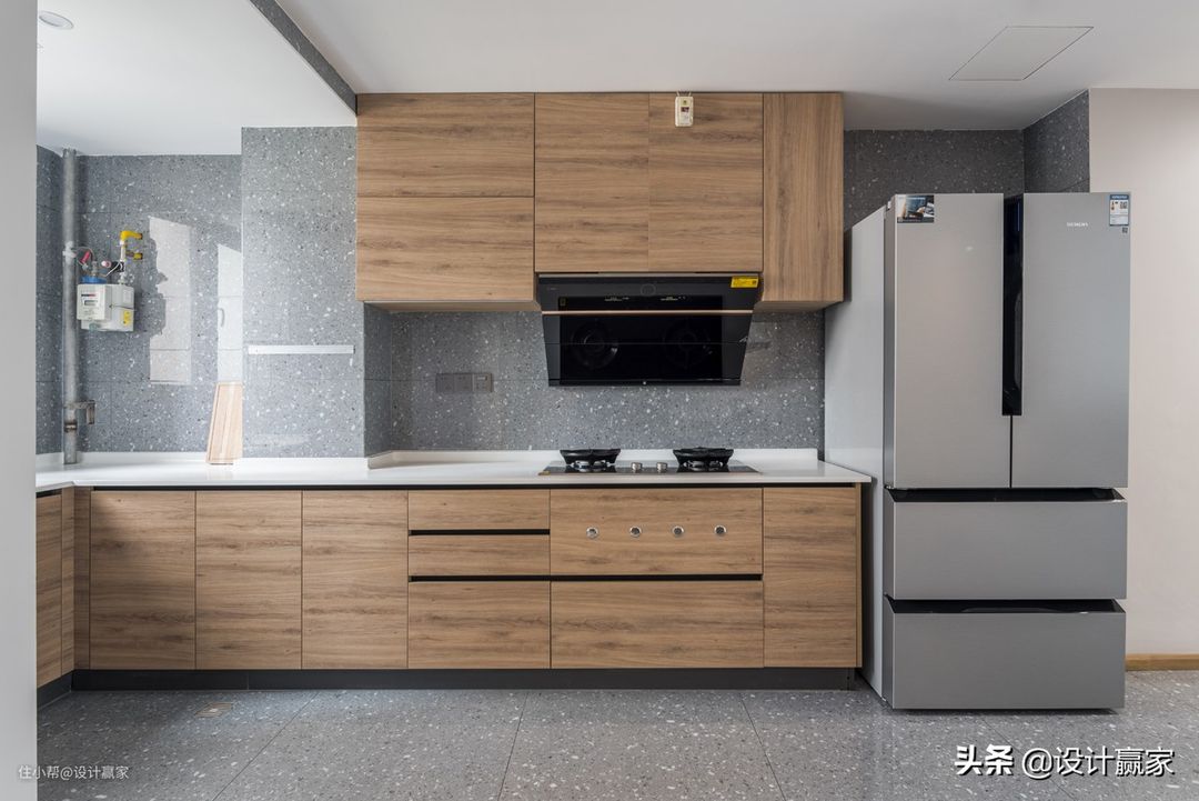 厨房以斑点砖铺设空间,再以木质橱柜进行点缀,形成冷暖的视觉对比。洗菜区、切菜区及炒菜区动线流畅,使烹饪成为一件轻松的事情。