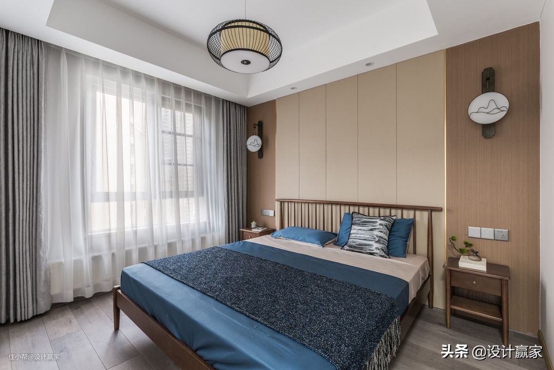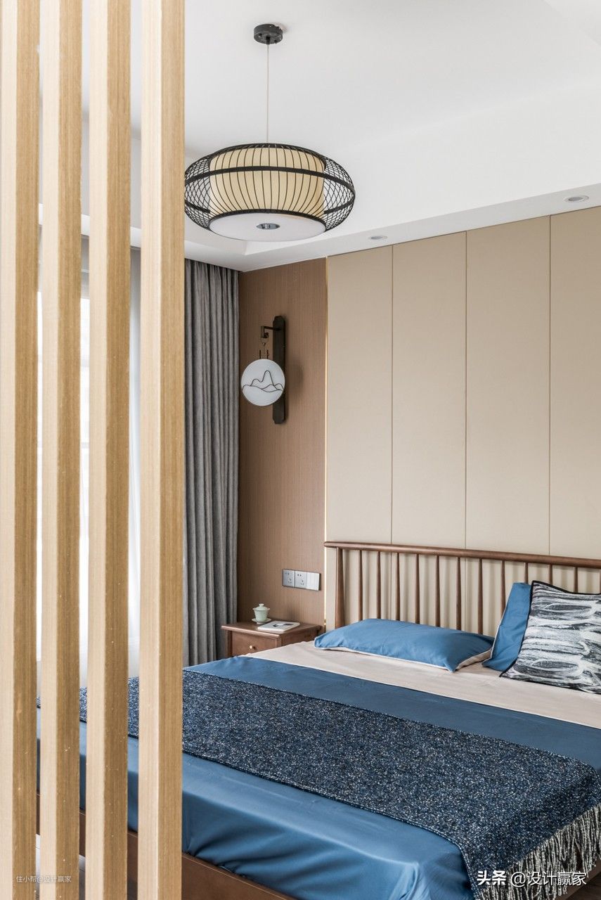 浅米黄搭配木纹饰面板,呈现色彩的渐进效果,显得素雅柔和。山水壁灯与空间主灯搭配,展现次卧的古韵色彩,孔雀蓝的床品效仿主卧铺设了床尾巾,营造出一个放松的睡眠空间。