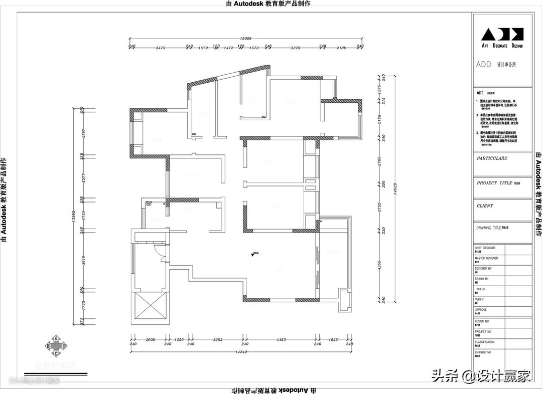 本案原始户型为5室,餐厅面积局促,过道狭长,主卧衣帽间无采光,且为异形户型,给日常生活造成诸多不便。