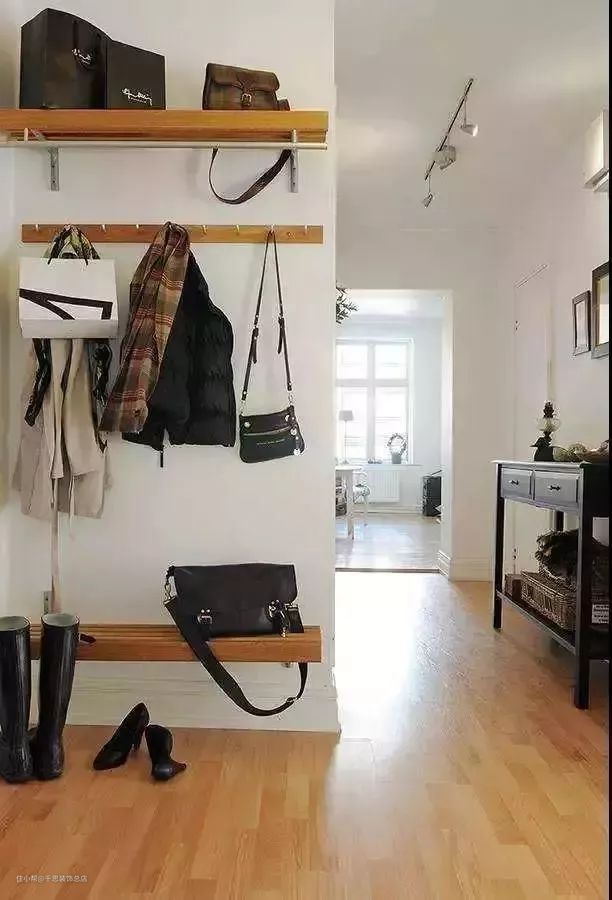 小户型在装修玄关时,可以充分利用墙壁的空间,这也是增加收纳、节省空间的一种方法,常见的是在墙壁上装挂钩、安装置物板、安装穿衣镜等。