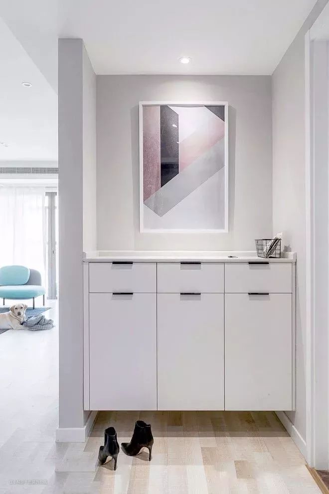白色、原木色、浅粉色、浅蓝色……都会让这个狭小的玄关空间顿时轻松了不少,一进家门,就能让人在视觉和心理上得到放松,感受到家的温馨。