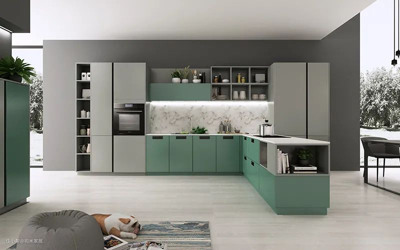 ❐ 莫兰迪绿:莫兰迪绿能够给空间增加几分清新和浪漫,独特的色彩能够彰显厨房主人的个性,清新的绿色也为厨房带来生机与活力。