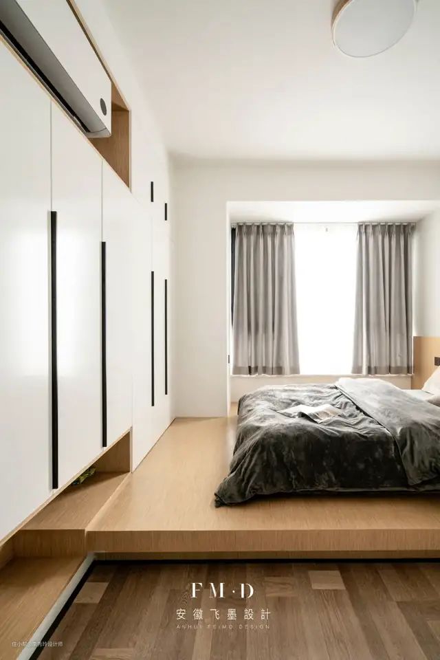 卧室就必须买床吗?那可不一定!地台床无论是功能还是颜值都完全能取代常规的床。比如《清浅》的卧室,将地台、床头柜、衣柜全部设计成一个整体,除了满足日常休息还承载收纳等功能。