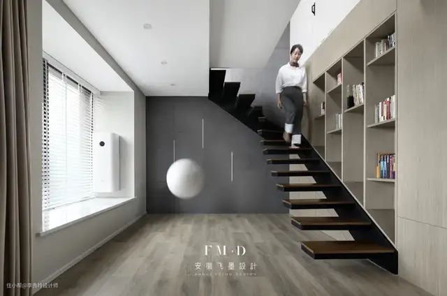 本案的楼梯就是悬浮式设计,若直接落地的楼梯,设计时需考虑地台承重问题。