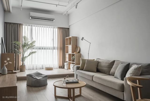 地台的造型大小高度可随着空间、需求而改变,在原本不规则的空间中设计地台,既不会显得压抑,还能提高空间利用率。例如《青木流年》客厅阳台的位置,空间狭小且不规则稍显鸡肋。