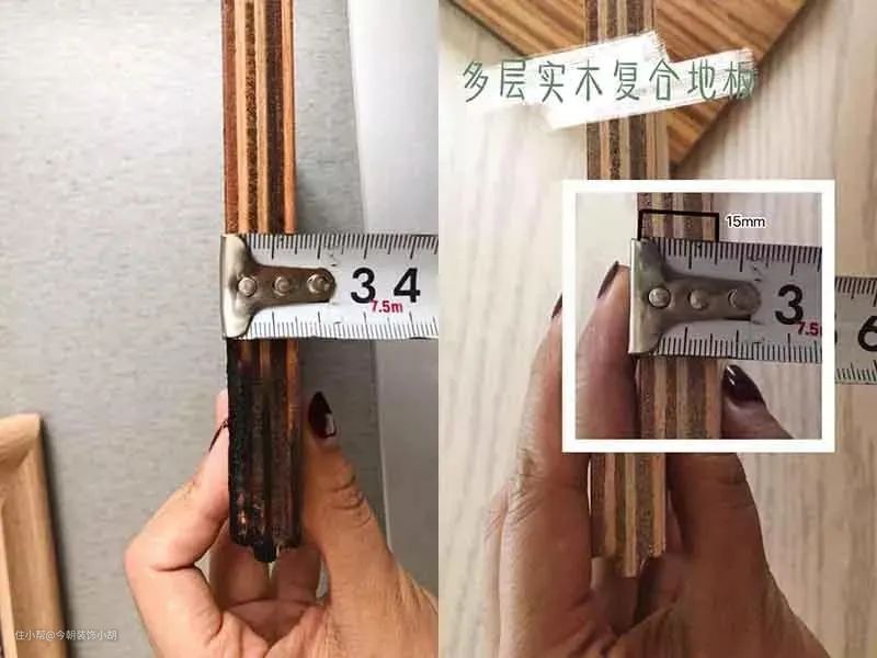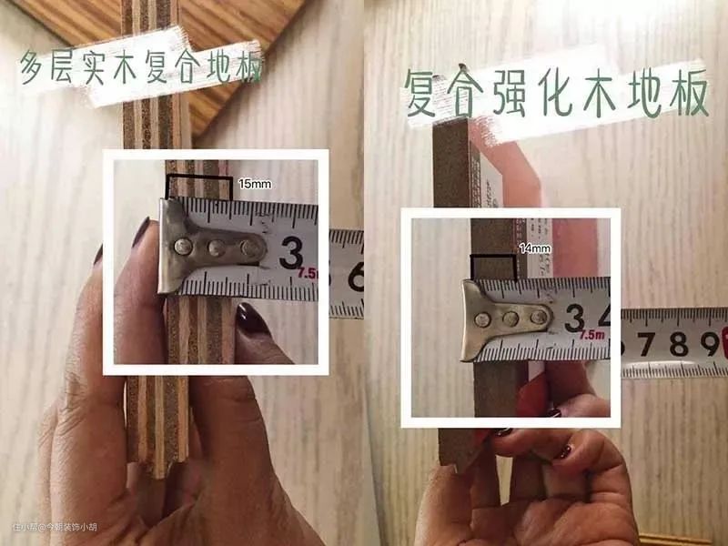 经过测量,多层实木复合地板的地板厚度为15mm,强化木地板的地板厚度为14mm,两者区别不大。
