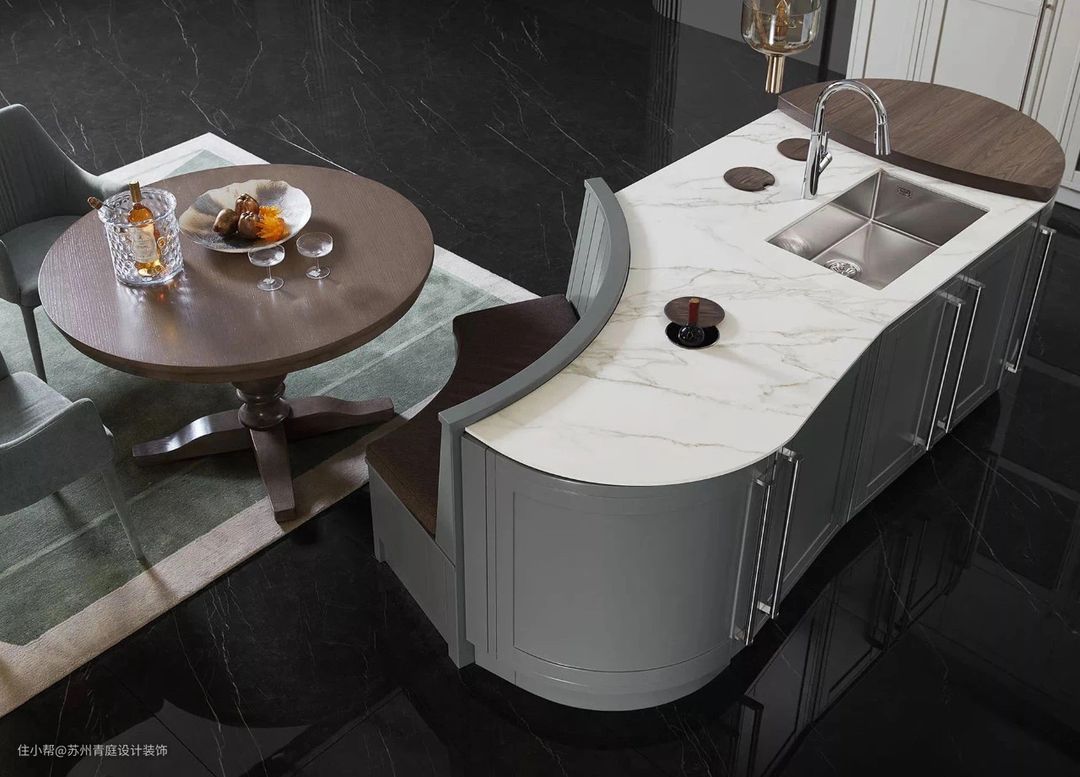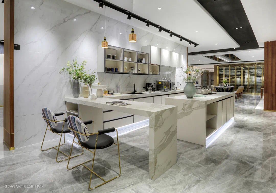 结合岩板特有的无惧高温、无惧刀锋、零渗透易清洁、健康环保等优势,厨房台面、餐桌面、橱柜门门板等运用岩板设计,无论功能还是颜值都实力抗打。