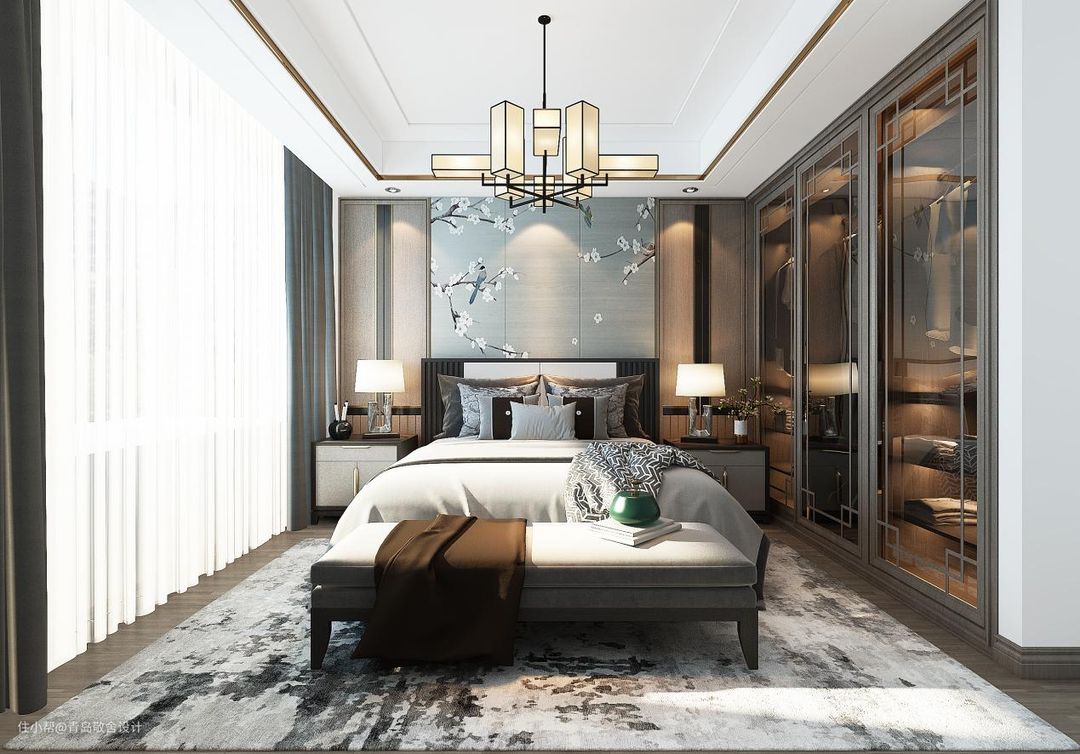 卧室和整体风格一致,梅花图案装饰充满意境美感,定制衣柜嵌入墙体,中式纹路装饰的玻璃门,使空间通透,衣物放的位置都一目了然,落地窗保证了室内采光,与自然相邻而居。