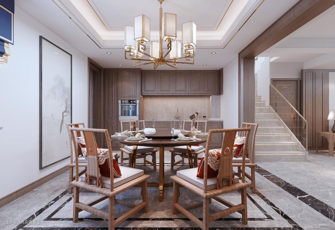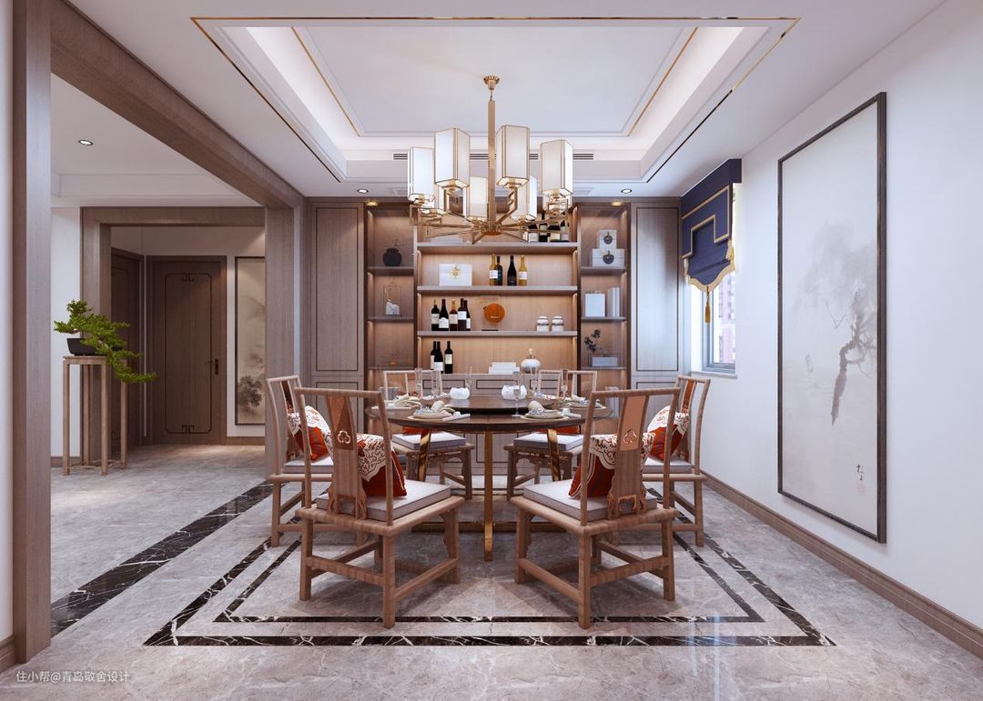 中式餐厅的美,重在意境。去除繁复的装饰,于细节处下笔,给人温馨、明亮、洁净的视觉感受。餐桌旁边就是橱柜,动线合理,于细节处方便最大化为生活服务。