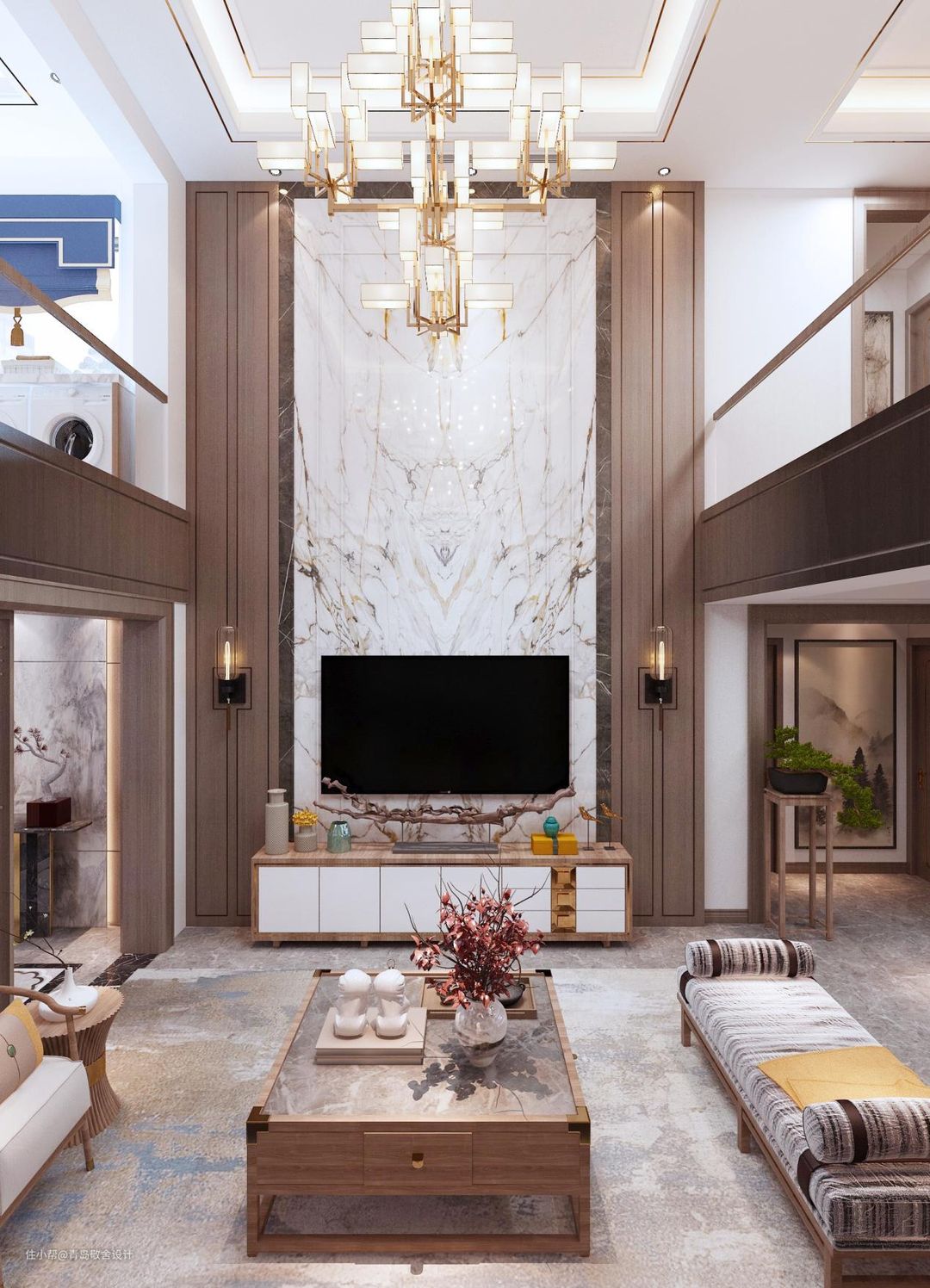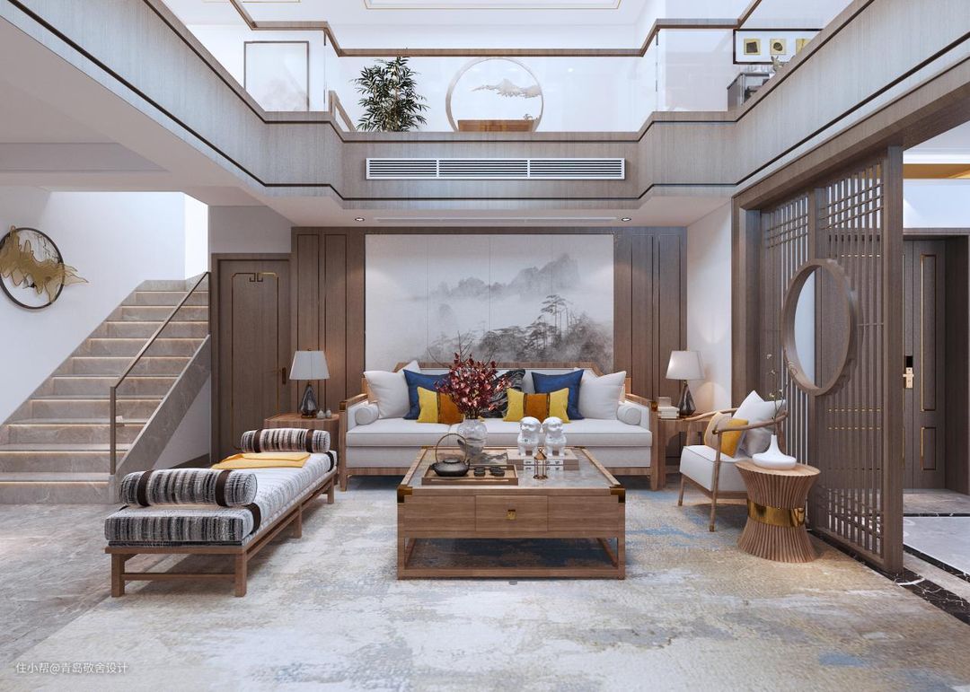 别墅客厅采用挑空设计,能够使视觉上更加的开阔,惊艳~使人在精神上感觉到舒缓、放松,有效地释放压力。