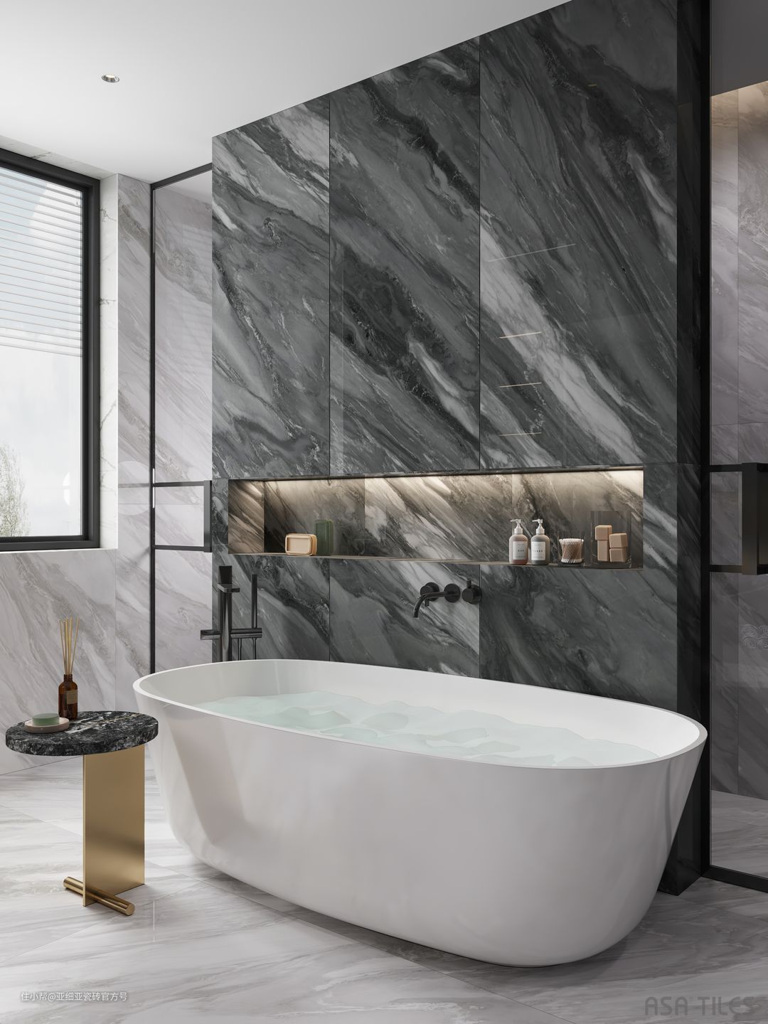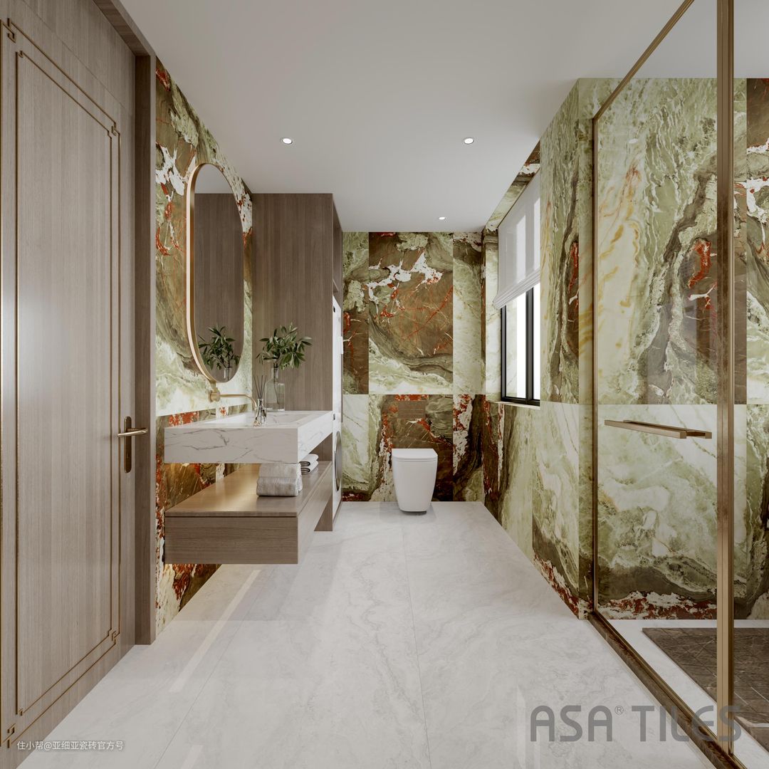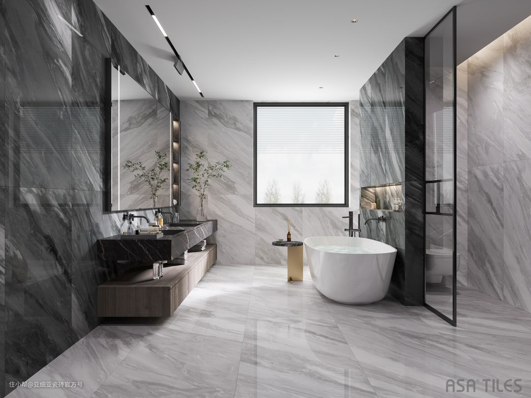 说了这么多,还是来欣赏一下亚细亚晶钻系列瓷砖在卫生间的应用案例,高级感的瓷砖也会为空间增色不少。这些案例相比一般的空间面积要大一些,所以瓷砖规格选用的是750mmx1500mm。