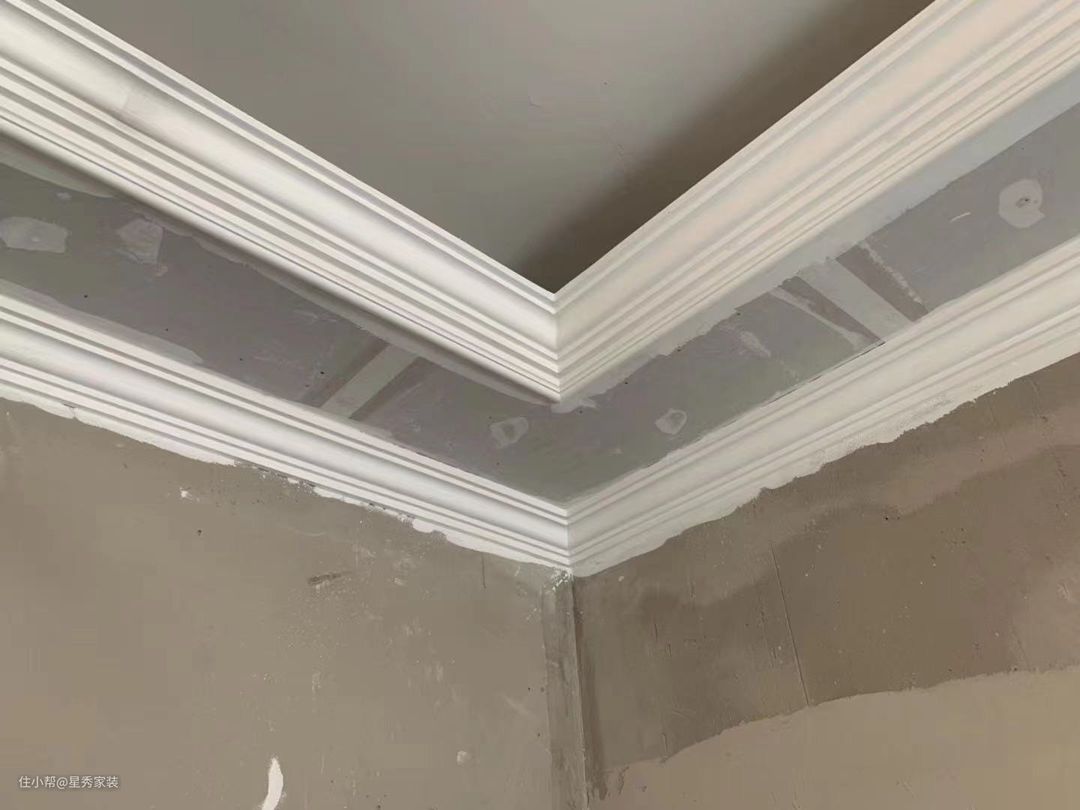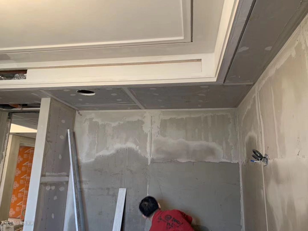 3. 石膏找平:通常为什么需要墙面需要石膏找平呢,墙面误差小于5公分就需要石膏找平了,如果墙面误差大于5公分,那就建议先用水泥在原有墙面找平,之后再用石膏找平既可。墙面大于5公分之上。那就用石膏板整面墙找平更佳。在施工之前需要房间阴阳角石膏找平处理。目前有阴阳角条镶嵌在石膏层 是为了阴阳角更直,更加好看。整个石膏找平的误差在3-5厘米后期就可以批刮腻子。所有的装修公司墙面都是顺平 而不是垂直。要是想要墙面垂直那就需要加一种工序,冲筋打点找平。