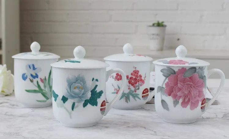挑选醴陵瓷器时,建议大家选择偏中式的款式,比如这家店铺销量最高的会议杯,杯身绘的就是红梅、兰花、牡丹等传统国画题材,很有古韵。