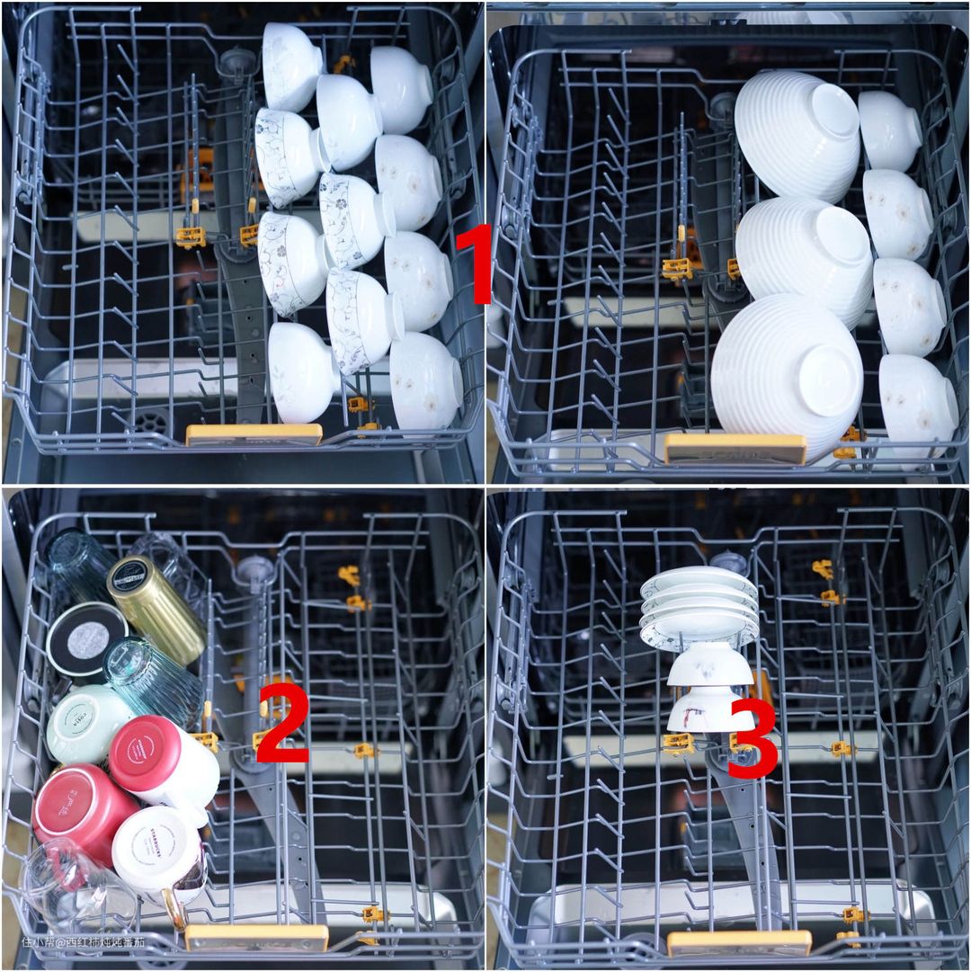 按照说明书的介绍,上层碗篮主要分为如上三个功能区:其中标记为数字“1”的的区域设计用于摆放中式饭碗,并且可以通过活动支架的调节,实现大汤碗的摆放;标记为数字“2”的区域则用来摆放水杯;数字“3”不大的区域可以用来摆放小件调味碟,也可以将支架折叠后摆放小碗 ▲