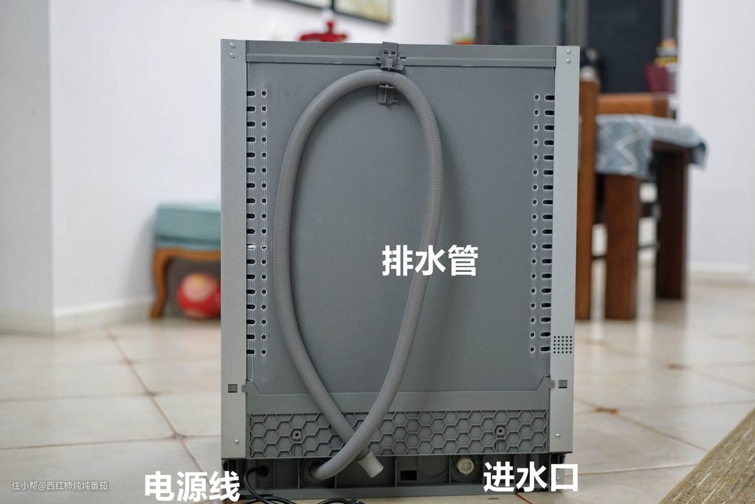 洗碗机背面分别有电源线、排水管以及进水口。让楼主感到意外的是,这台机器的背面也被一层包裹的严严实实,”隐蔽工程“处理地相当用心 ▲