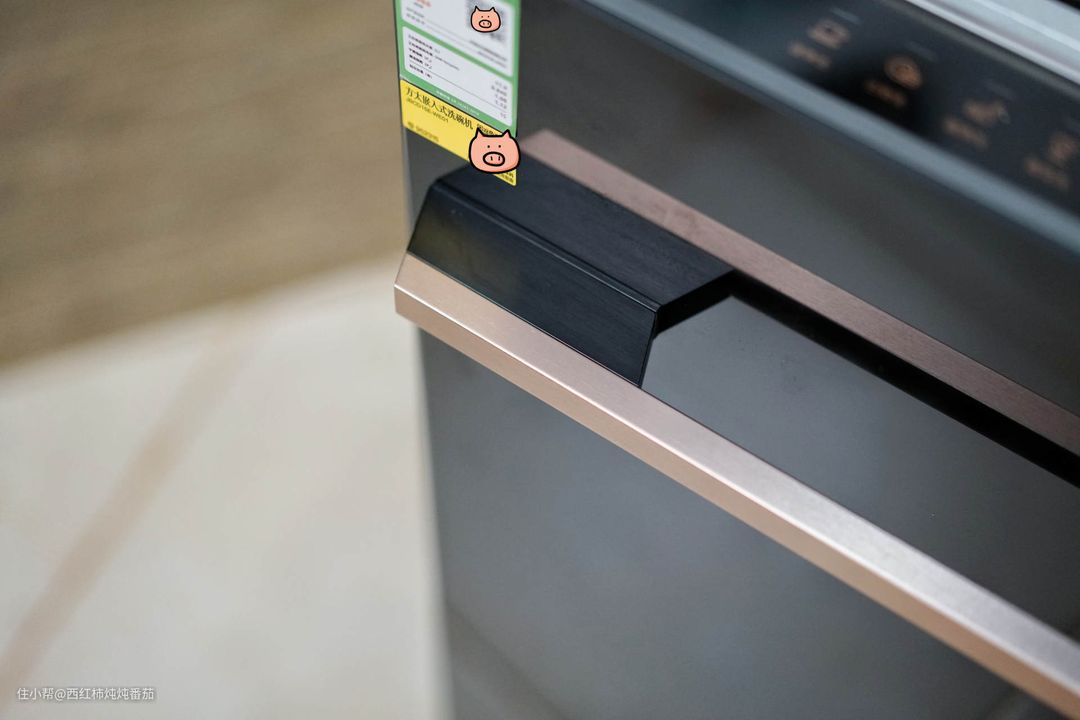 洗碗机并不算高,钢化玻璃面板,配上玫瑰金的把手,再饰以方太经典的橙色 LOGO,整机看上去质感十足 ▲