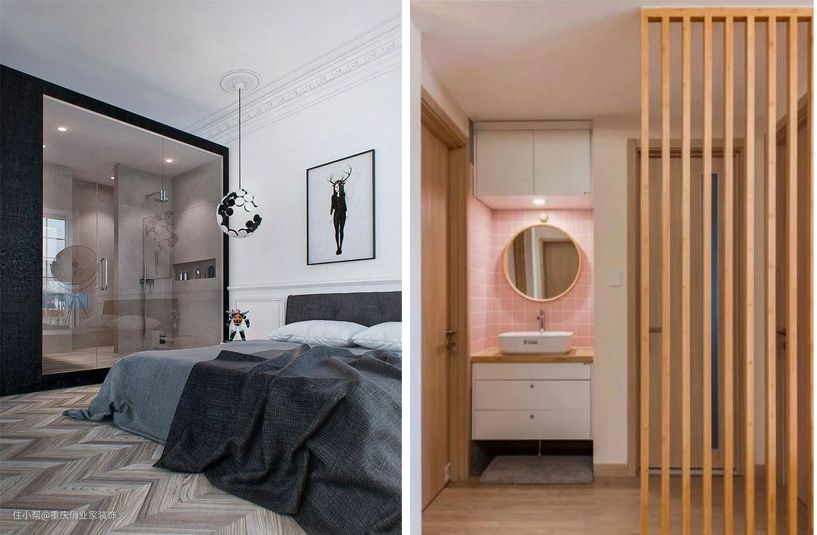 直接在卫生间和床之间加一堵轻体墙也是一种做法,嵌入收纳柜或者设置挂钩做装饰墙或者挂衣帽,增加储物空间,缓解户型带来的尴尬。