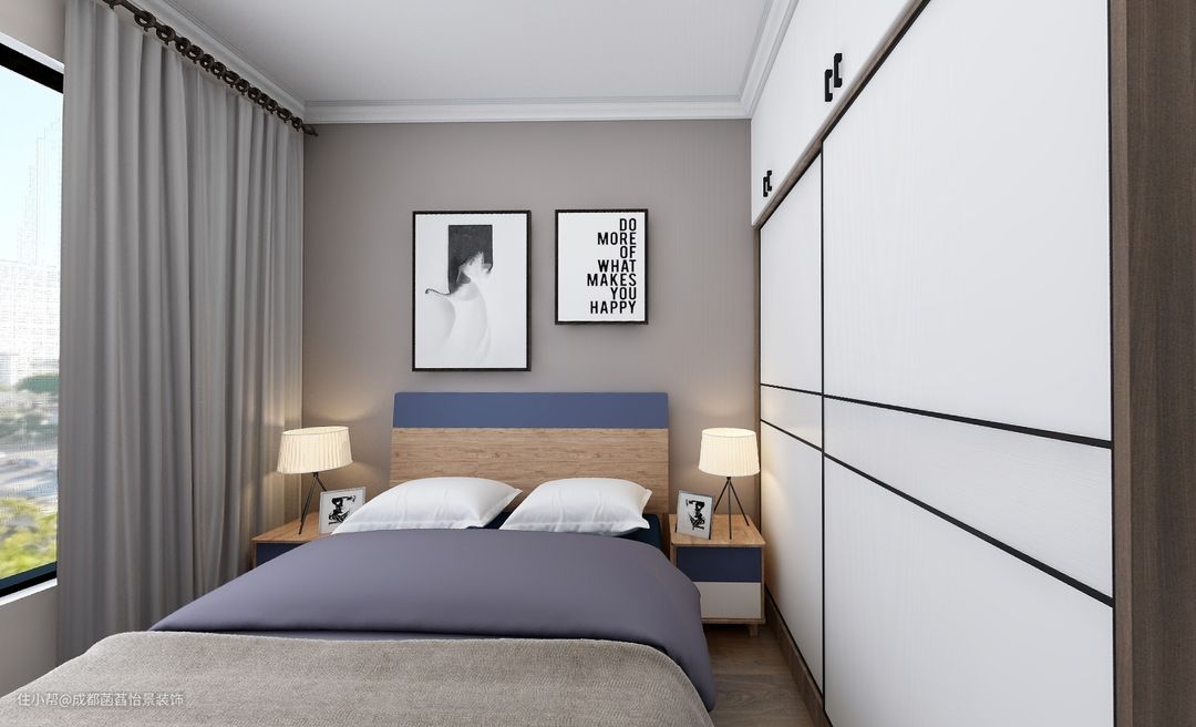 灰色调为次卧的主色调,灰蓝色床品进行点缀,木色调中和了冷色调的清冷感,简约而温暖的恰到好处。