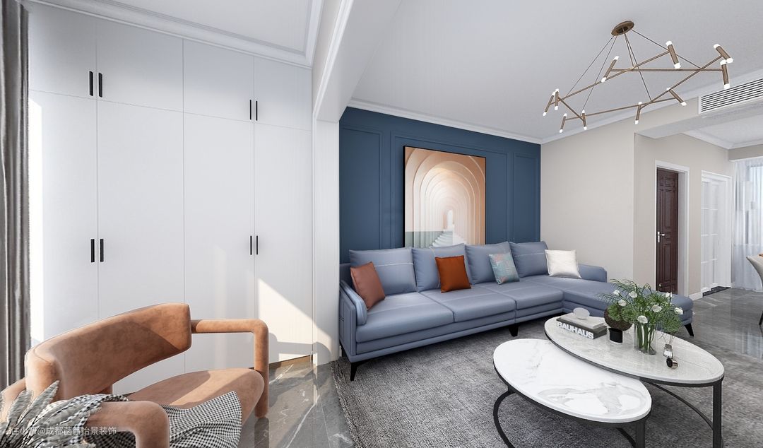精心设计的专属家庭沙发背景墙,清新自然。同时,蓝色也奠定了整个家的色彩基调,营造出一种温馨有爱的家庭氛围。