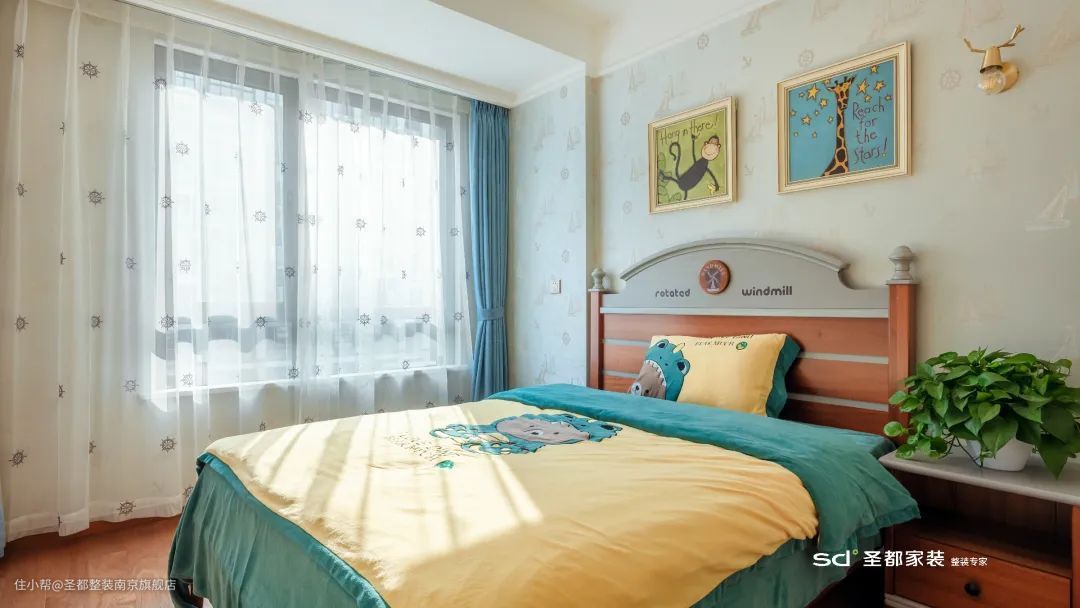 儿童房选择朝南、光线充足的房间,不仅让空间趋于通透明亮,还有利于保护孩子的视力。