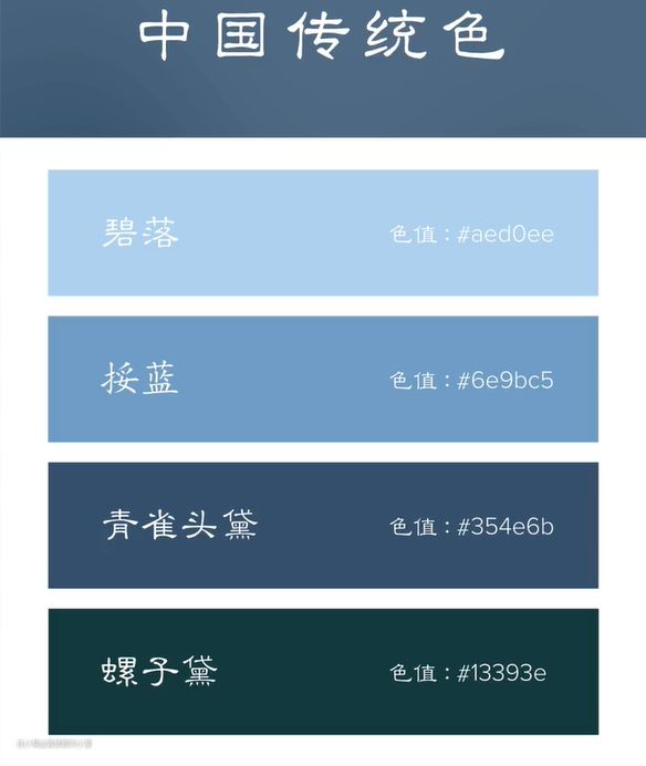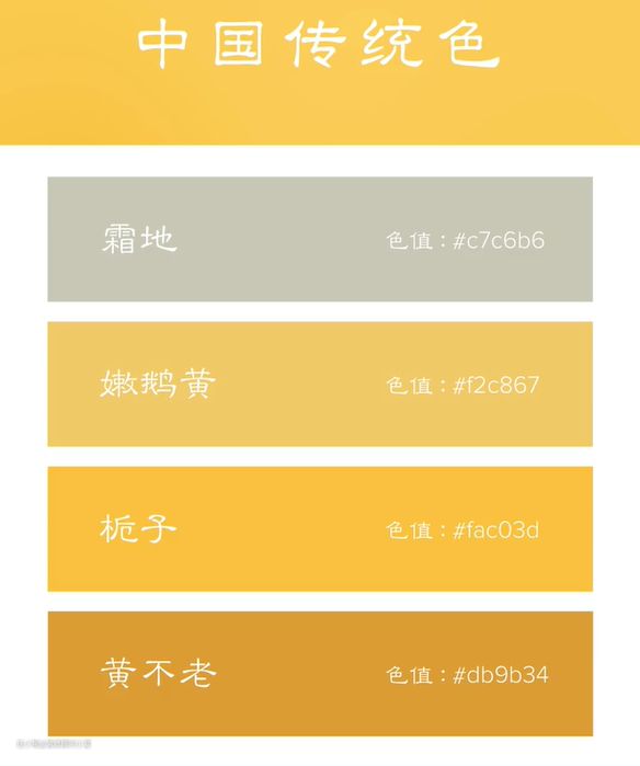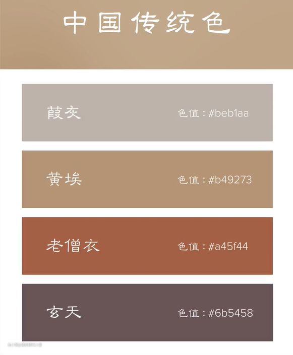 中国传统颜色中,红色不叫红,叫“丹镬”;黄色不叫黄,叫“栀子”;绿色不叫绿,叫“蒹葭”;蓝色不叫蓝,叫“碧落”;褐色不叫棕,叫“玄天”;灰色不叫灰,叫“霜地”;黑色不叫黑,叫“青黛”……