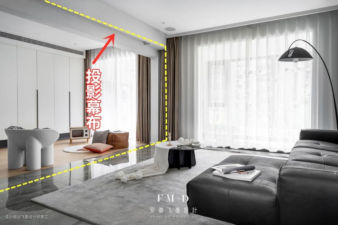 第一种将非承重墙拆掉,中间安装隐藏投影幕布,实现多功能共享空间。