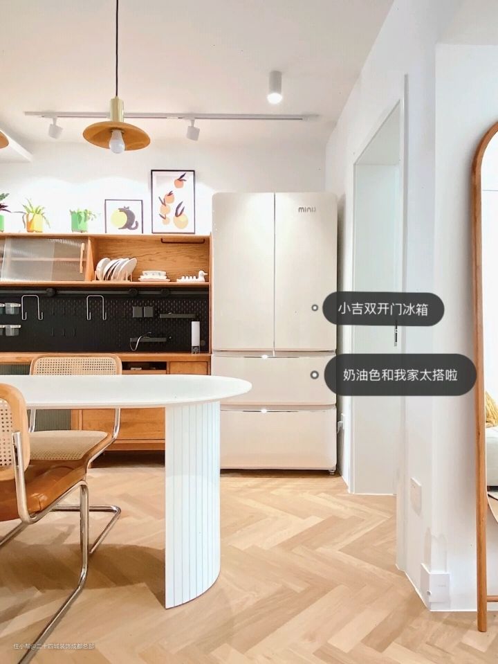 全屋定制做的整体橱柜,选的奶油色的门板和樱桃木的柜体超白的石英石台面,柜子的拉手是女主自己后来配的,厨房奶呼呼的超好看;