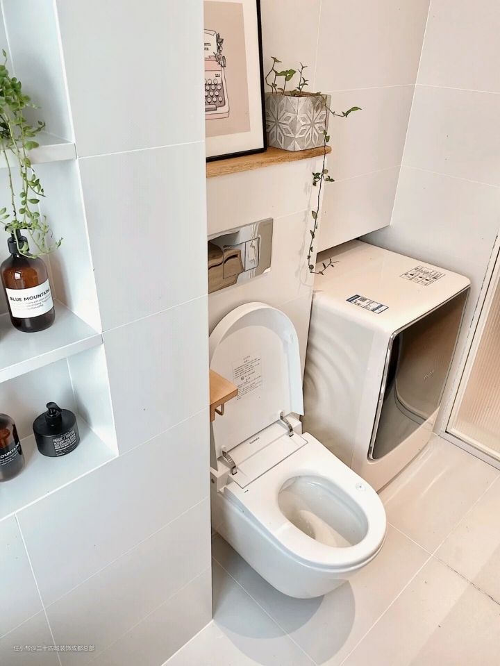 空间本身就很小,想把它两同事放进去真的花了不少心思,她家卫生间和厨房一墙之隔,在墙上偷了一点空间,把卫生间和厨房的墙面挖了一个洞,将洗衣机塞进去,后面厨房部分再用地轨包起来,这样洗衣机只占用洗手间很小的地方,这样的设计使小小的卫生间也不会很拥挤。