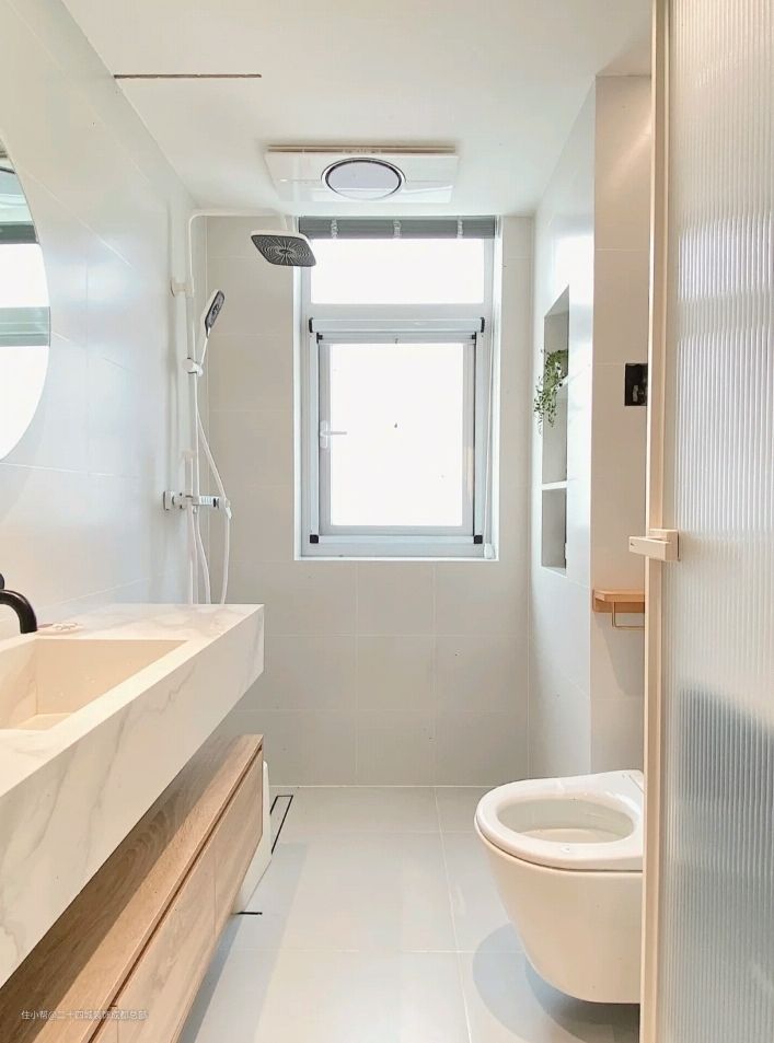 卫生间只有3.8㎡,首先给大家介绍硬装部分,墙砖尺寸是300*600,轻微的奶油白色,地砖尺寸600*600,轻微的灰白色,美缝是众力高01瓷白色。
