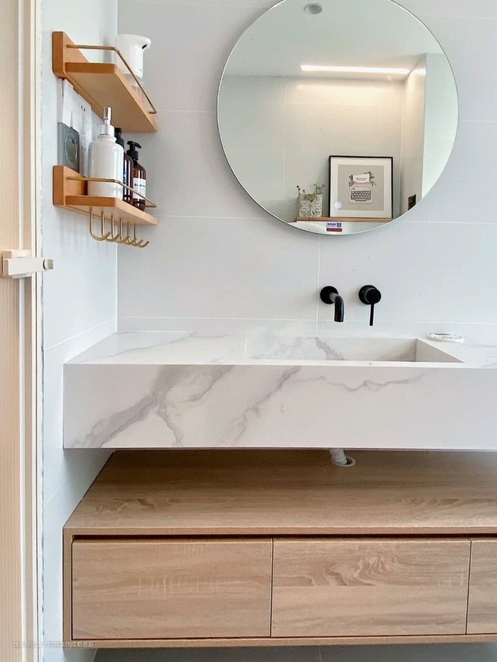 浴室柜的质量绝了!岩板材质的台盆一体,超级高端,木色部分的抽屉也超级能装,颜值绝了,而且性价比超级高。