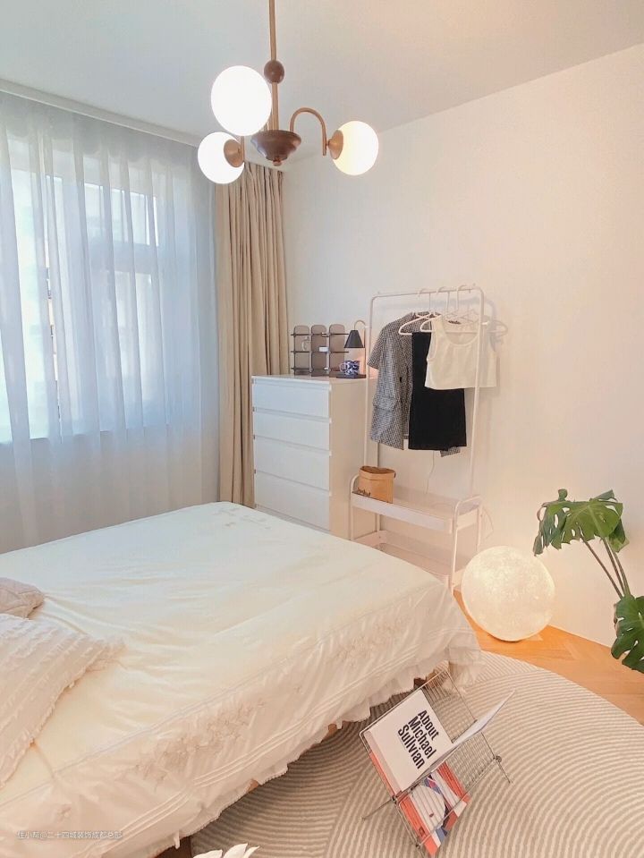 卧室的整体装修很简单,本着重软装轻硬装的原则,只铺了木地板,刷了大白墙,就连衣柜都没做,做了一个宜家的金属衣架便宜又环保,再装上了纱帘感觉还不错,卧室看起来更柔软了。