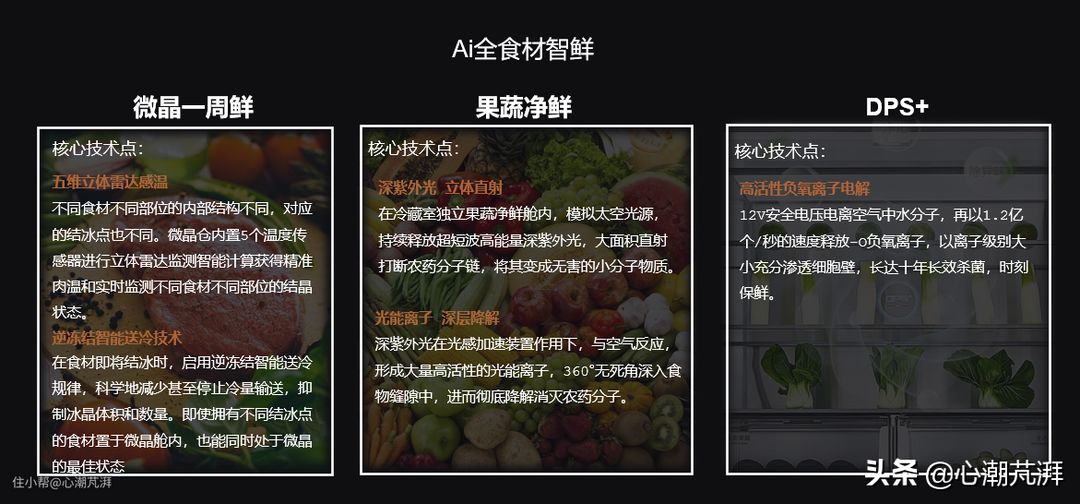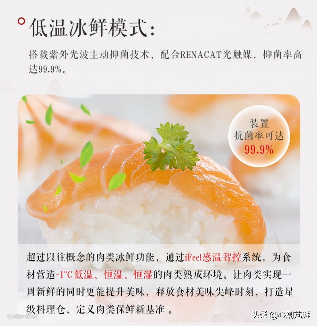 微晶一周鲜:5大温度传感器精准感应肉温,超导托盘,将温度传感传到至冰箱控制中心;智能保鲜算法, 逆冻结智能送冷,精确控制送冷,保证肉类食材不会结冰。本质就是温控更好的微冻保鲜。