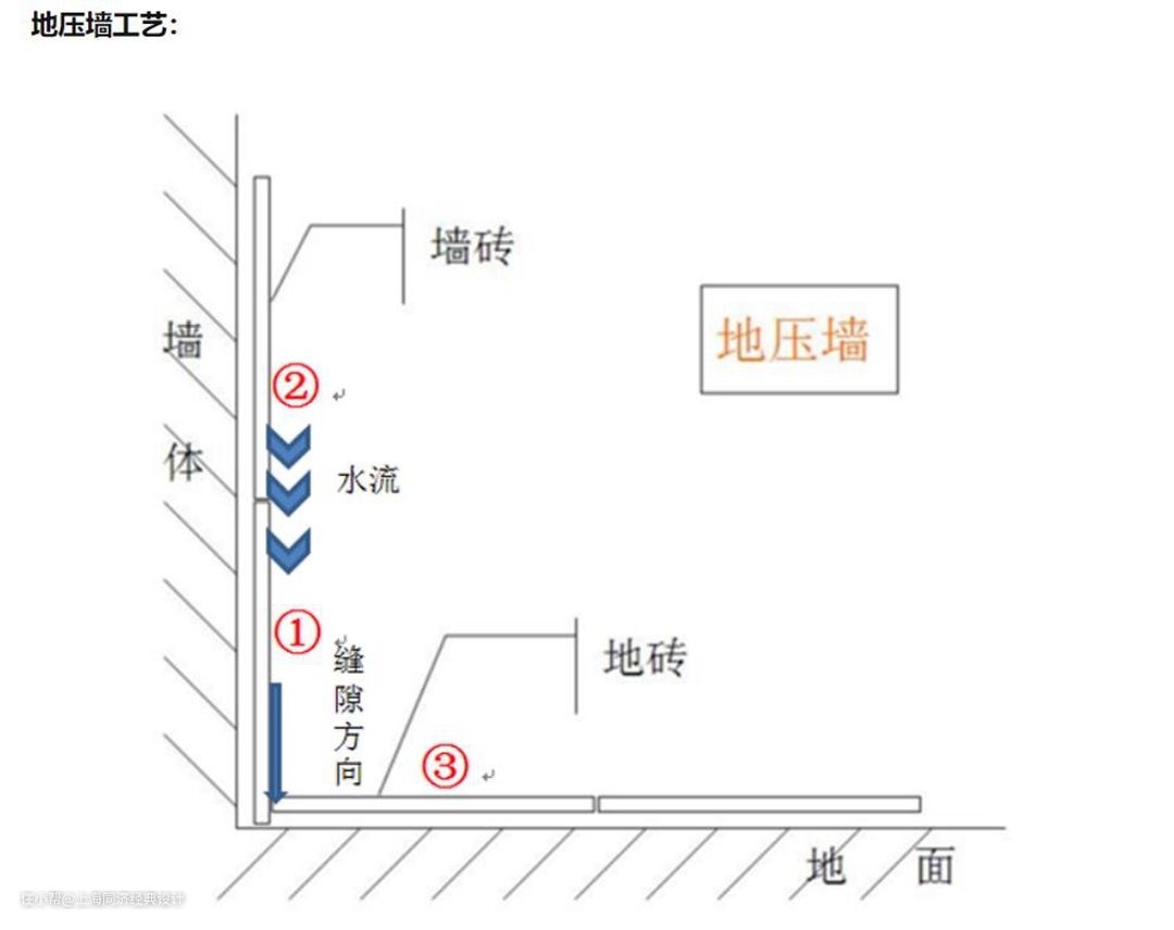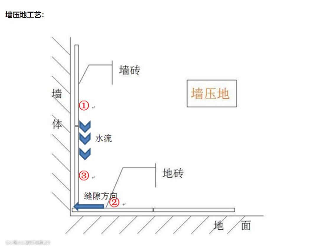 而相比来说地压墙则正好相反,从示意图也可以一目了然。工艺步骤则是相当简单,直接从最底下网上贴墙砖,全部贴完再贴地砖即可,超级简单易操作。对泥工来说这个操作简直是省时又省力还更容易贴得平整,但坏处也很明显,墙砖和地砖之间会留下明显的“朝天缝”。地压墙接缝是竖直的,水在重力作用下会往下渗透到防水层。往往这样做法的泥工也不大会在墙角做弧形粉平工艺,在墙角处的防水涂料很有可能存在薄弱处。常年累月,在墙角的防水层薄弱处造成防水层老化,从而就会产生渗水的情况,而且渗水点都找不到,极其令人头疼。