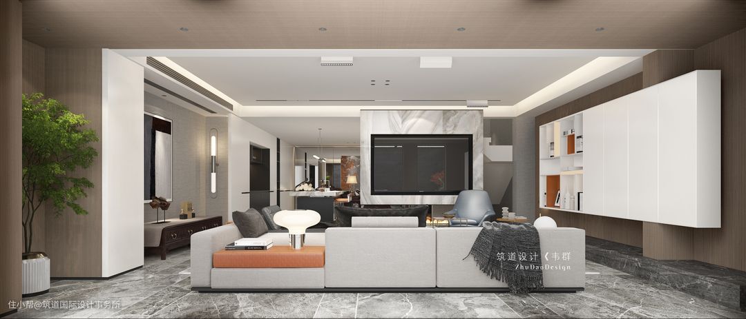 吊顶大量的留白会让人的注意力下移,然后便会被独立于水吧台与客厅中间的电视背景墙所吸引。