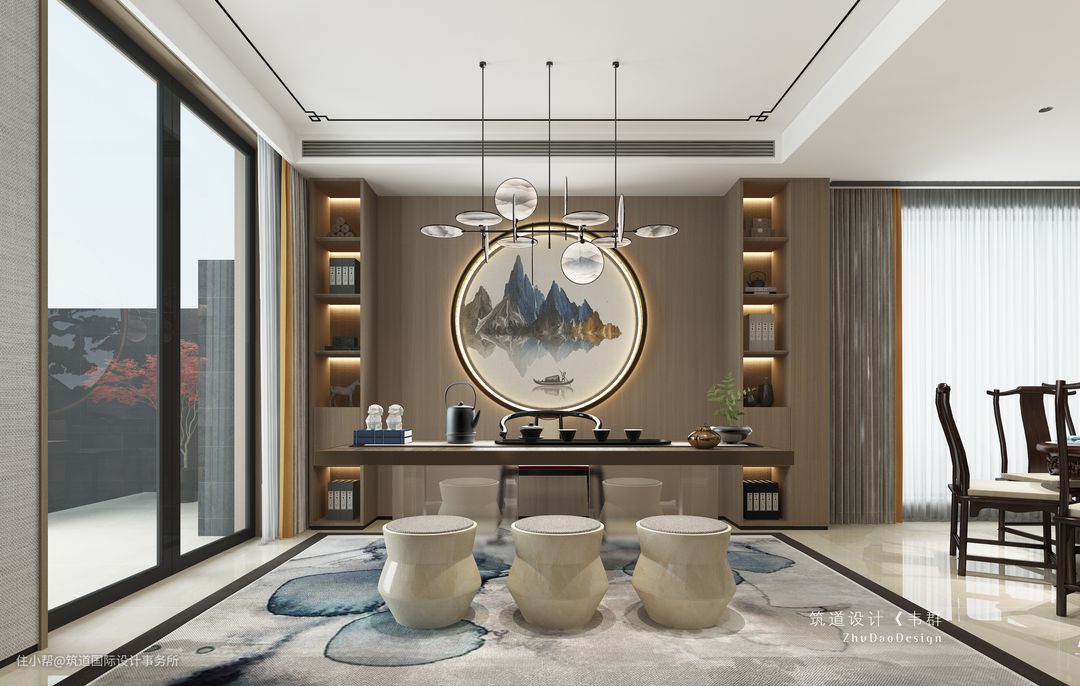 位于一层的品茗区,吊顶为方,背景嵌圆,有圆有方便是中国人内心的写照,一圆代表着外表和顺,一方代表着内心端正,方圆以成规矩,正是房屋主人内心的诠释。