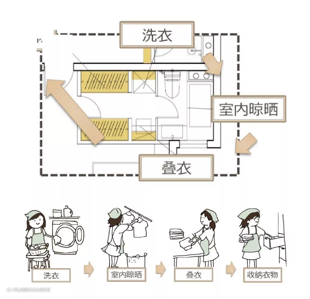 洗衣动线一般是:洗衣—晾干—收衣—叠衣这4个步骤,而在这几个步骤中,我们所需的时间或路程越短,整个动线就会越合理。