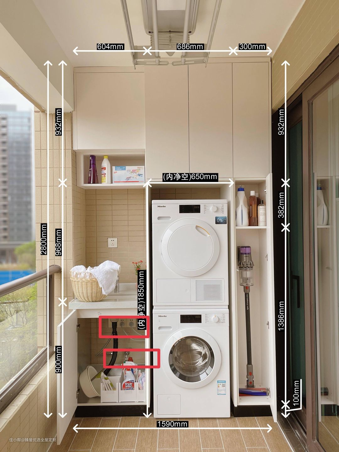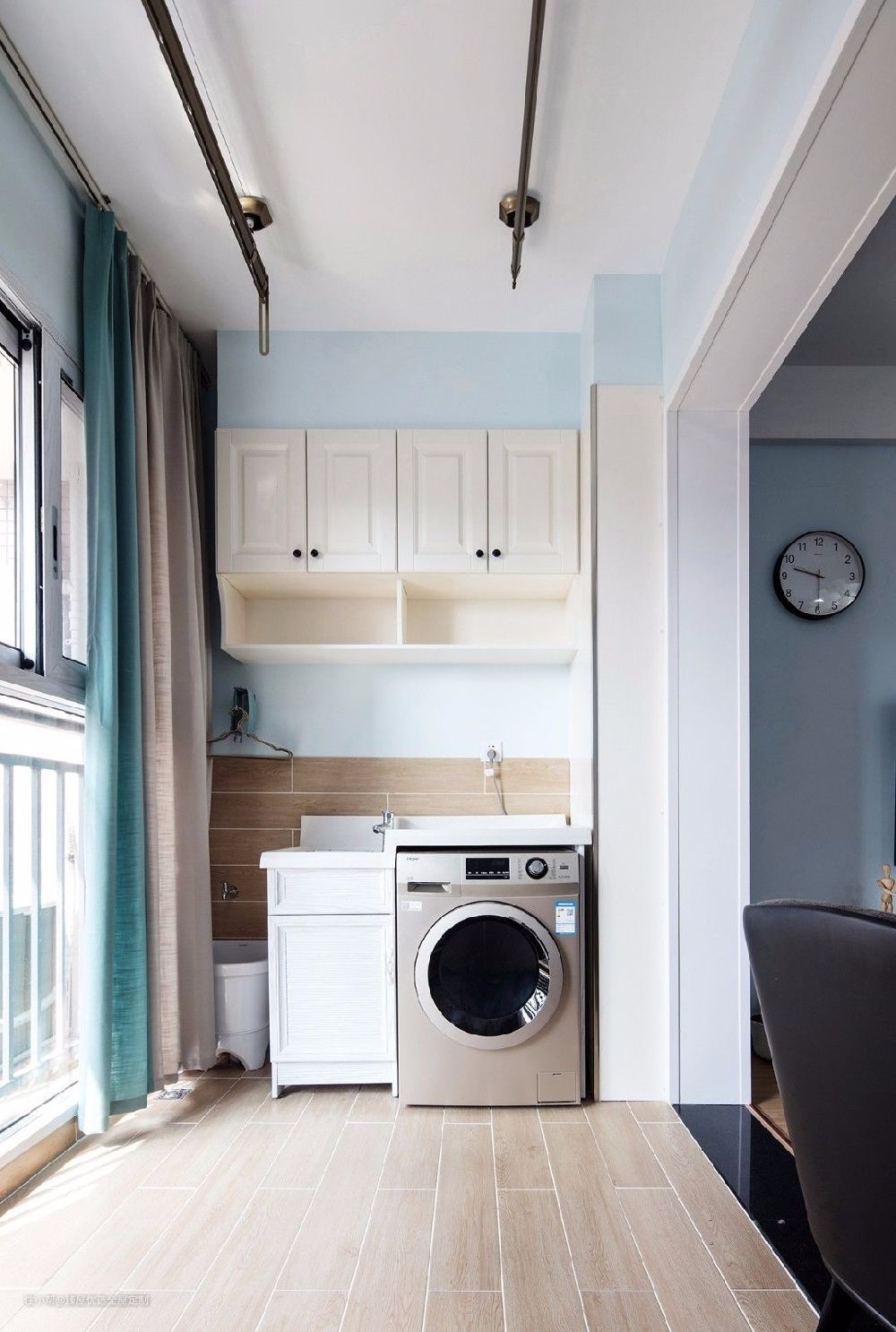 但是需要注意的是,洗衣机如果长时间在太阳下暴晒,容易对机身寿命有很大影响,我们的建议是在阳台定制阳台柜,定制的阳台柜可以根据需求做到严丝合缝,尺寸也更加贴合。同时也能遮挡管道,起到修饰的作用。