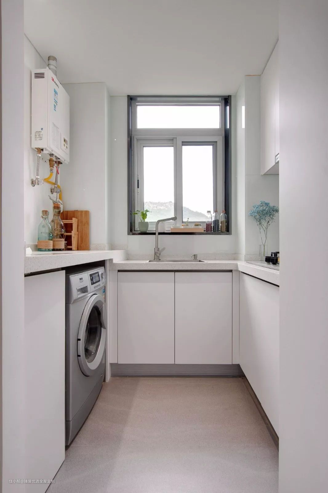 如果说你的家里无论是阳台还是卫生间,都无法放入洗衣机,也可以考虑将洗衣机放在厨房的区域。厨房与卫生间一样,都安装有上下水管,不用重新规划。