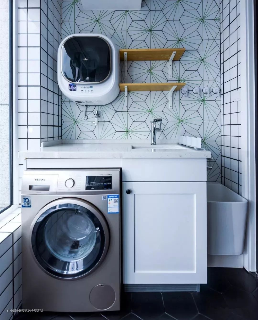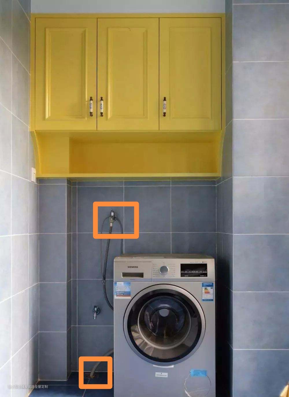 ︎如果是将洗衣机放在洗衣柜里,可以将进水阀与插座留在台盆下方,在安装时只需在柜体中间留下一个小孔,将水管与插座将水管与插座穿过去即可,视觉来说更隐形。