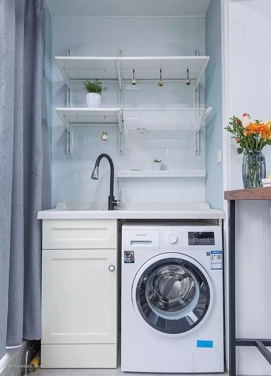 将洗衣机的进水阀与插座全部置于台面上方,开关插销也会更方便,也能保证洗衣机与墙面贴合效果。