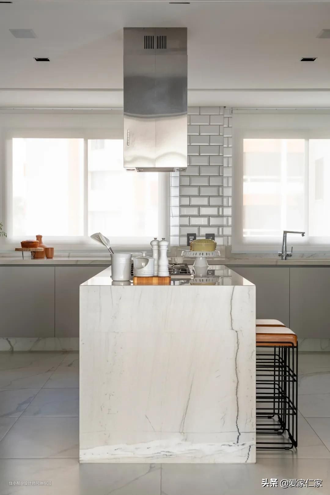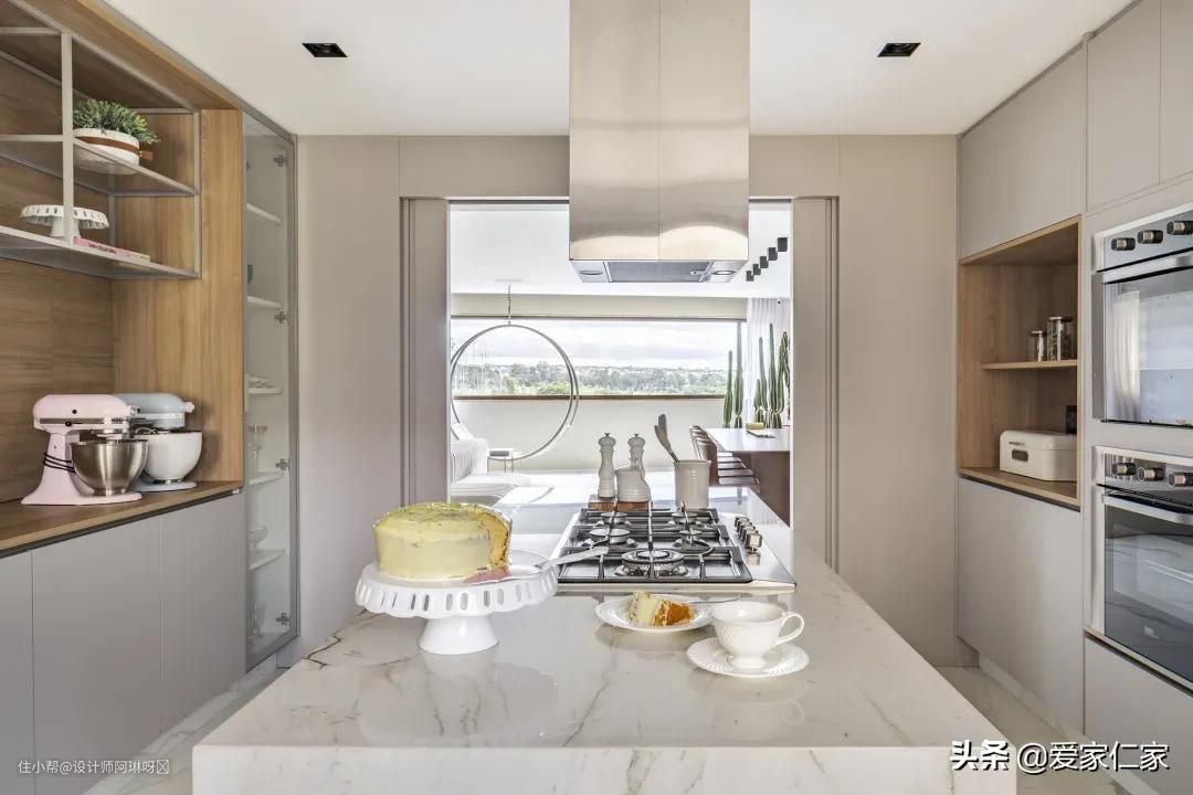 除了三面靠墙的操作台面外,厨房中间还设计了一座岛台,人少时也可以用作吃简餐的小吧台。如果你家厨房够大,做个岛台还是挺实用的。