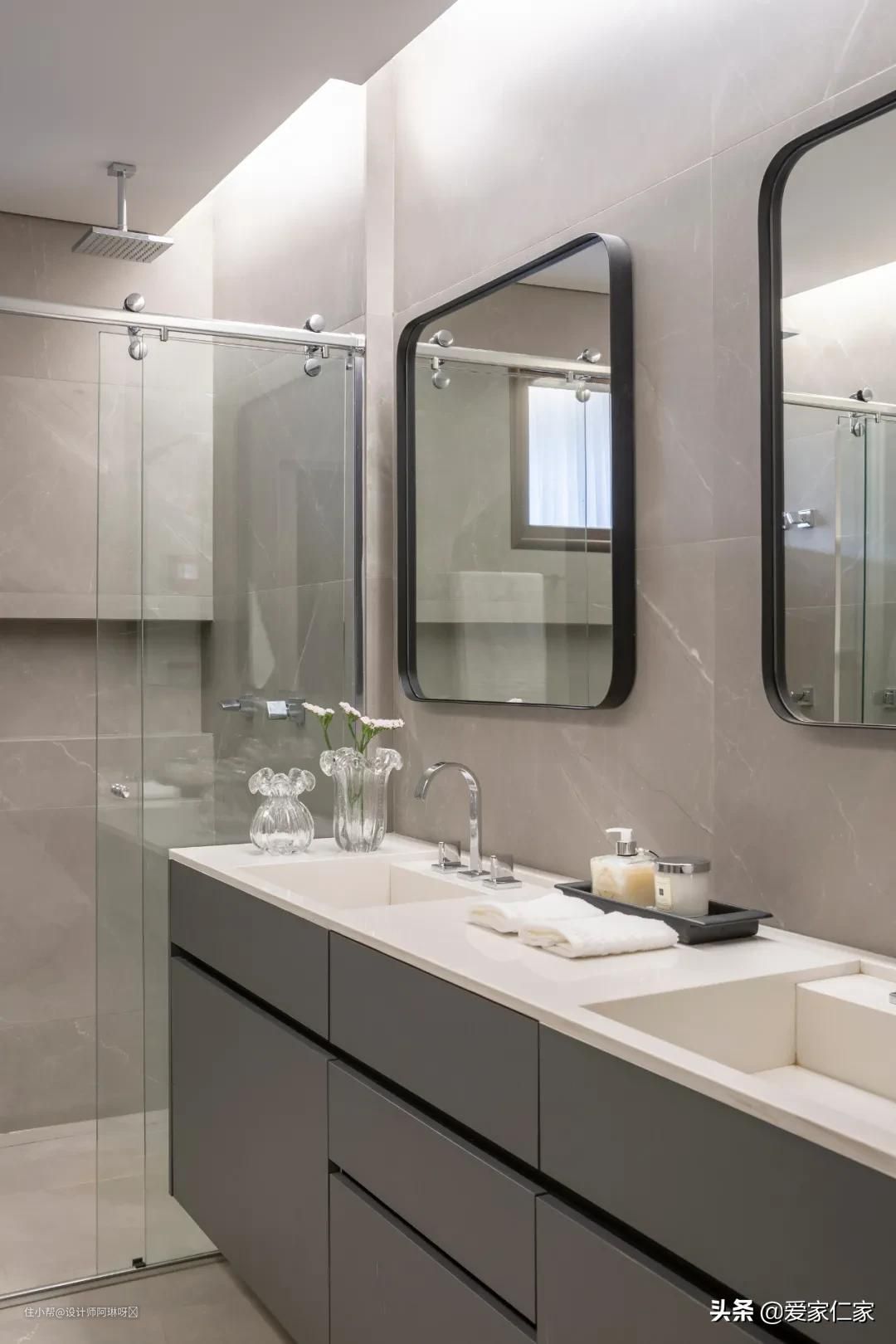 主卧浴室做了双台盆设计,夫妻俩早上起来不用再排队洗漱了,居住体验满分,房子大就是任性,如果你家条件允许,可以考虑这样的设计。