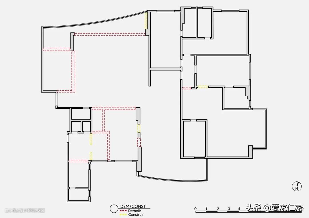 我们先来看下户型改造方案,红线部分是砸掉的墙面,黄线部分是需要加砌的墙面,总共砸掉了11面墙壁,改动还是挺大的。