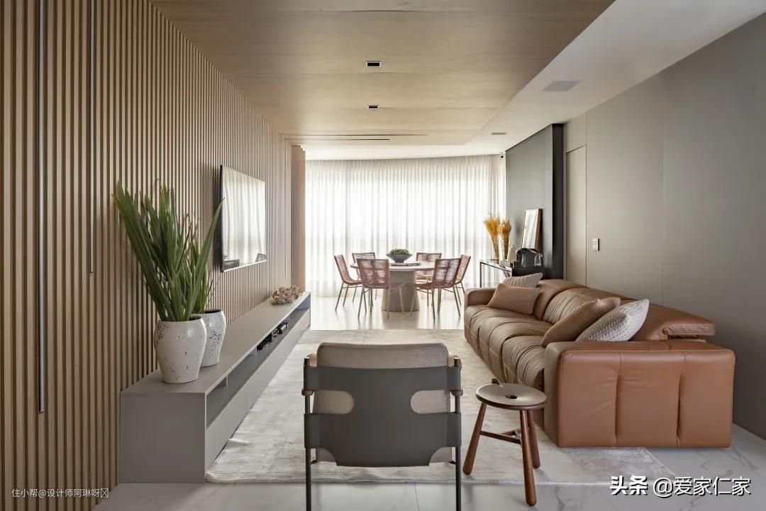 除了刚刚介绍的大客厅以外,本案还有一个小客厅,就在厨房边上。相比外面的大客厅而言,这里的配色要更丰富一些,更显温馨,用木材装饰的电视背景墙一直延伸到吊顶,奠定了温暖柔和的空间基调。双客厅的设计使用起来非常灵活,有客来访时,使用大客厅,可以享受社交聚会的乐趣;独处状态则使用小客厅,感受温馨的私家空间。
